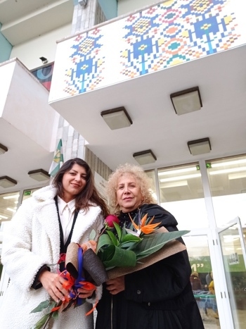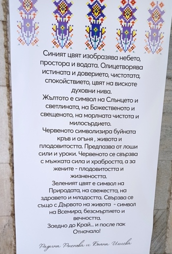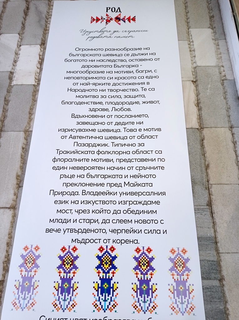 „Аз съм художник, потомка на Бенковски трето поколение, това наклони везните и в един момент ДНК-то се материализира“, призна Радина Росенова. „Приела съм изкуството си като мисия – да бъда посланик на българските символи в България и пред света. През 2020 г. имах щастието да представя нашата страна на световно изложение на художниците в Дубай, където моята картина – диптих „Българска магия“, бе избрана в Топ 10 на изложението („Знаме“ писа за това след събитието, б.р.). Оттам се зароди идеята за Арт проект „Род“. Той е в две части, първата от които е създаването на колекция от 28 платна, които отговарят на нашите 28 административни области. Илюстрирала съм шевица от всяка област и съм я съчетала с културно-историческа или природна забележителност. Целта ми е възраждането на нашите мотиви, защото те са вселенски код. Те са изключително мощни символи. Това е една молитва, която нашите баби, докато са везали, са отправяли – за здраве, за любов, за защита, за благоденствие… Вярвам, че можем да изградим мост между новото и вече утвърденото. Благодаря на Община Пазарджик в лицето на г-н Тодор Попов за възможността национален проект „Род“ да стартира именно от Пазарджик. Шевицата на обществени места трябва да ни възвърне това чувство за принадлежност. Да видим нещото, което ни свързва. Благодаря му и за това, че освен за спорта, обръща голямо внимание и на културата. Това е нещо, от което се нуждаем в тези времена. Искам да благодаря и на моята майка, с която заедно изрисувахме тези шевици и наричахме. Тази творба всъщност едно огледало на нашето намерение да покажем чрез примера си, че когато обединим две поколения – млади и стари. Както тя казва, когато слеем мъдростта и младостта, поемаме по пътя на вечността. Създаваме нещо устойчиво. Създаваме любов. Искам да благодаря на всички вас, че заедно запазваме родовата памет“, обърна се към присъстващите Радина.