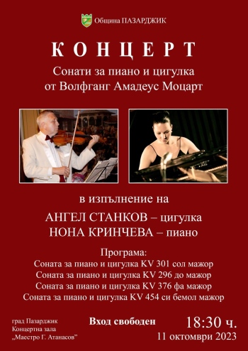 Събитието, организирано от Община Пазарджик, е с вход свободен, а концертът е подготвен в чест на 75-годишния юбилей на големия наш музикант. В програмата са включени четири сонати за пиано и цигулка на Моцарт в изпълнение на проф. Станков и талантливата пианистка Нона Кринчева.