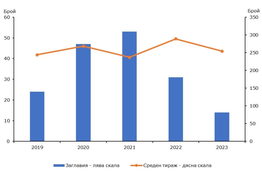В сравнение с предходната година броят на издадените книги и брошури намалява със 17 (54.8%), както и средният им тираж от 289 на 254, или с 12.1%.