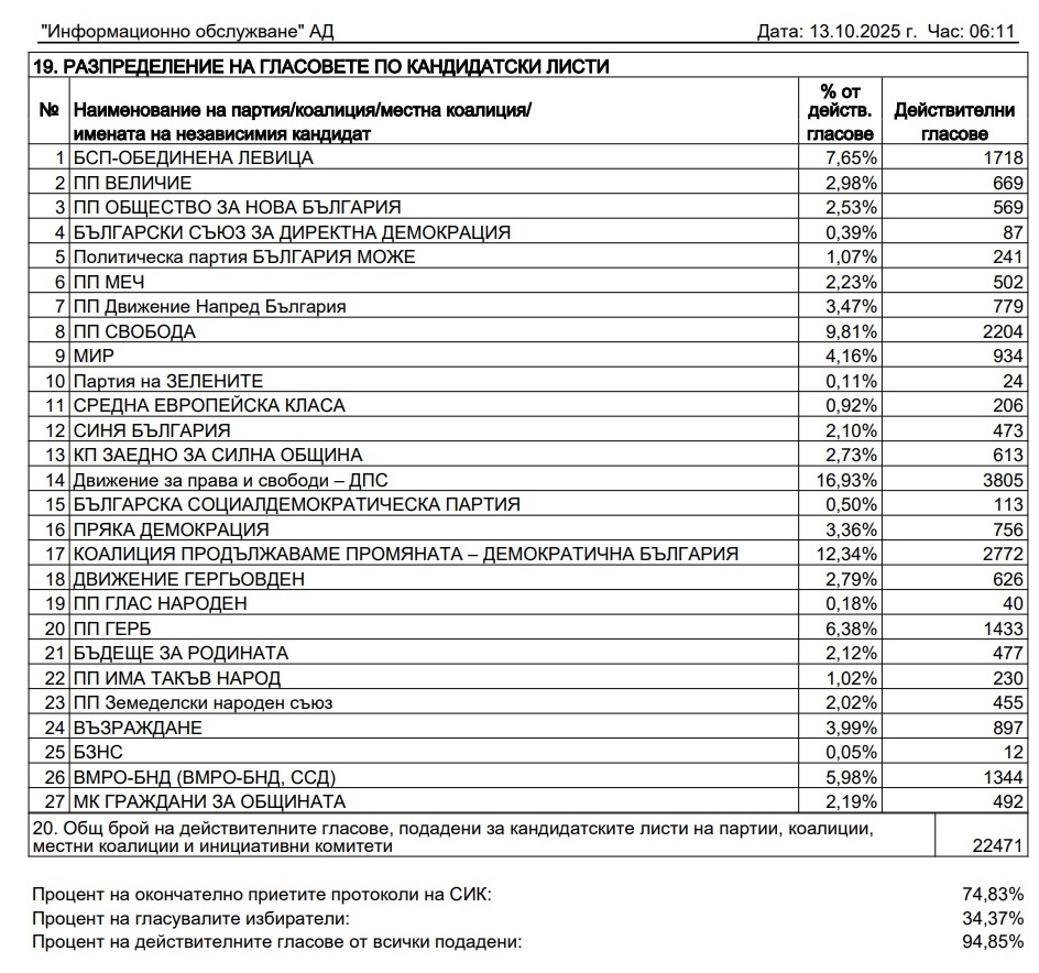 От ОИК-Пазарджик оповестиха междинни данни при 73,83% от обработените протоколи. Така ДПС води с 16.93%, следвано от ПП ДБ с 12.34%, 9.81% за ПП "Свобода", "БСП – Обединена левица" с 9.65%, ГЕРБ с 6.38% и МК "ВМРО – БНД" с 5.98%, МИР с 4.16%, "Възраждане" с 3.99%...