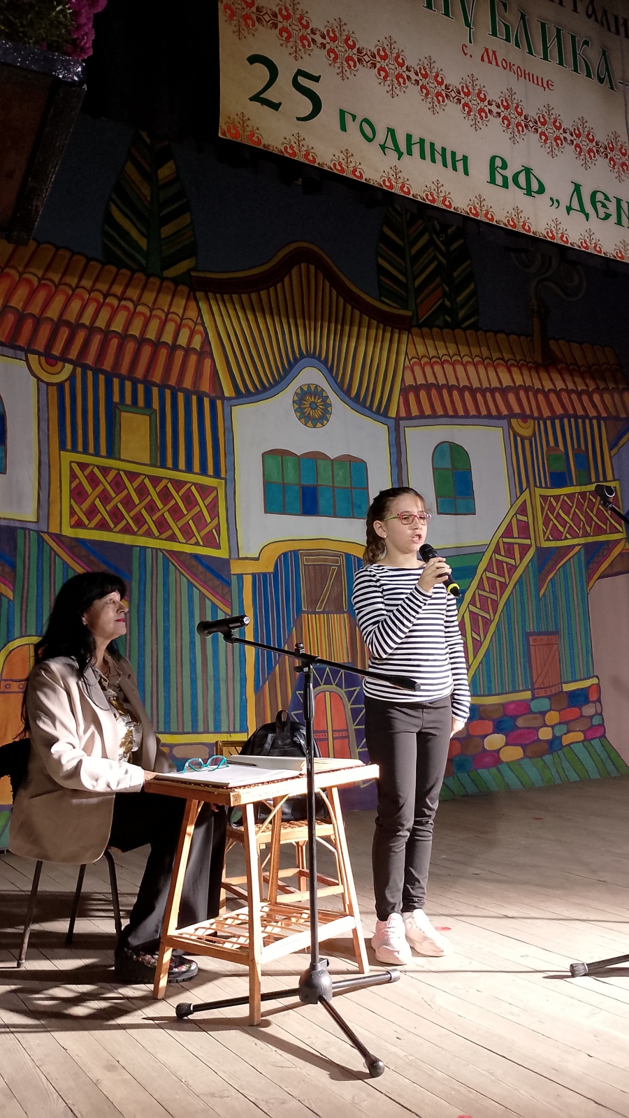– създадена през 2022 г. и водена от Иванка Илиева. „Слънчогледите“ също се гордеят с множество отличия, включително Гран При. По време на концерта те пяха заедно с ВФ „Деница” и ФФ „Мокрищянка”. Пълният салон аплодираше изпълненията и на Лорена Йорданова и Кристиян Чалъков от СУ „Георги Брегов”, децата от Изнесена група „Звънче” към ДГ „Валентина Терешкова”, актьорите в сценките Юлия Врескова, Антония Янкова, Величка Новакова, Гергана Чавдарова и Мария Мострова. Николай и Емил Балабанови, танцьорите от „Ню Арт Център“-Пещера…