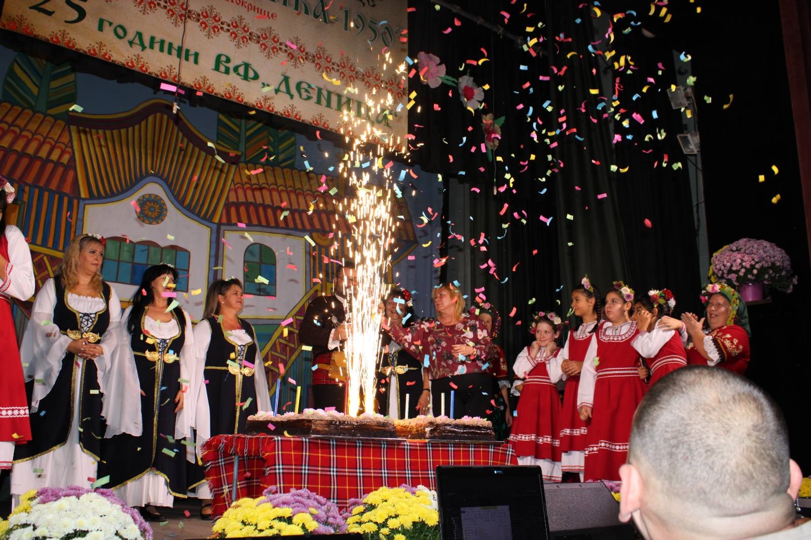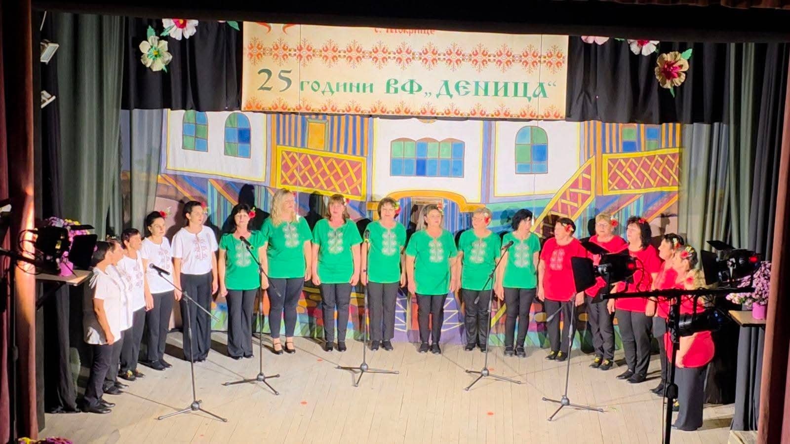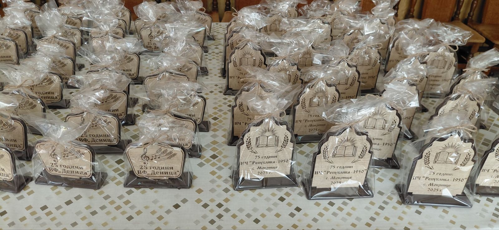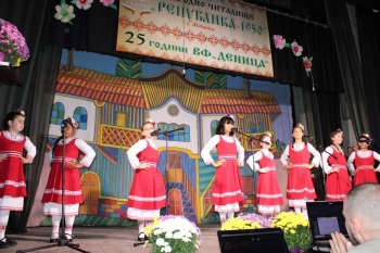МОКРИЩЕ. Двоен юбилеен празник имаше в селото послучай 75-годишнината на НЧ „Република“ и 25 години творческа дейност на Вокална формация „Деница“ в унисон с Деня на будителите - 1 ноември. Богатата програма започна със знаковата за всеки българин песен „Излел е Делю хайдутин“, изпълнена от малката Рая Дочин (съпровод на гайда - Николай Балабанов) и завърши с „Многая лета“ и разрязване на торта. Имаше много цветя, приветствия и пожелания от представителите на Министерството на културата, местната власт, културните и образователните институции в региона. По случай празника читалището