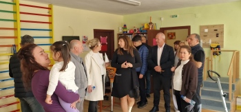 Делегацията посети и Дневния център за деца и младежи с увреждания. Директорът Маргарита Радева разказа, че тук се осигуряват дневна грижа, терапия, рехабилитация и обучение за придобиване на умения, както и подкрепа и застъпничество за децата. Гостите разгледаха кабинетите и залите, в които 57 деца на възраст от 3 до 18 години и един младеж на 21 години работят със специалисти за социализация и изграждане на самостоятелност.