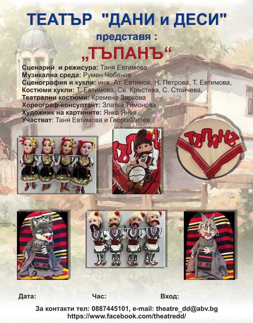 На 17 ноември хасковският Театър „Дани и Деси“ ще гостува с безплатно представление в Панагюрище . В 11 ч в читалище "Виделина" любителите на кукленото изкуство ще гледат спектакъла „Тъпанъ“, с който трупата отбелязва 30 години от създаването си. Постановката е реализирана по проекта „Създаване, популяризиране и разпространение на невербален куклен спектакъл“ , финансиран от Европейския съюз по програма Национален план за възстановяване и устойчивост.
