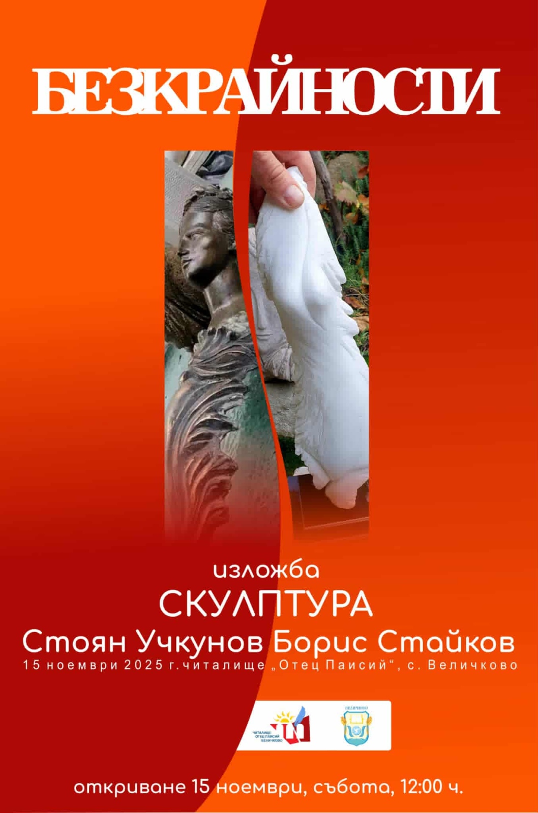 ВЕЛИЧКОВО. В новото светло пространство на фоайето на НЧ "Отец Паисий – 1930 г." беше открита скулптурна изложба "Безкрайности" на Стоян Учкунов и Борис Стайков. Авторите бяха представени от художничката Мария Дамянова и поздравени от Емилия Апостолова - председателят на читалището, което отбелязва 95 години от своето създаване