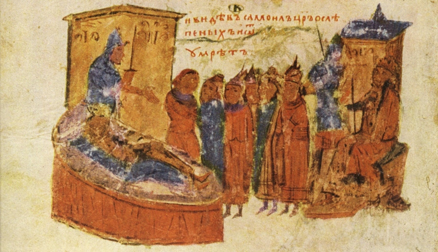 ТЕКСТ СНИМКА: Умиращият Самуил и ослепените му бойци (миниатюра от препис на Манасиевата хроника, XIV в.)