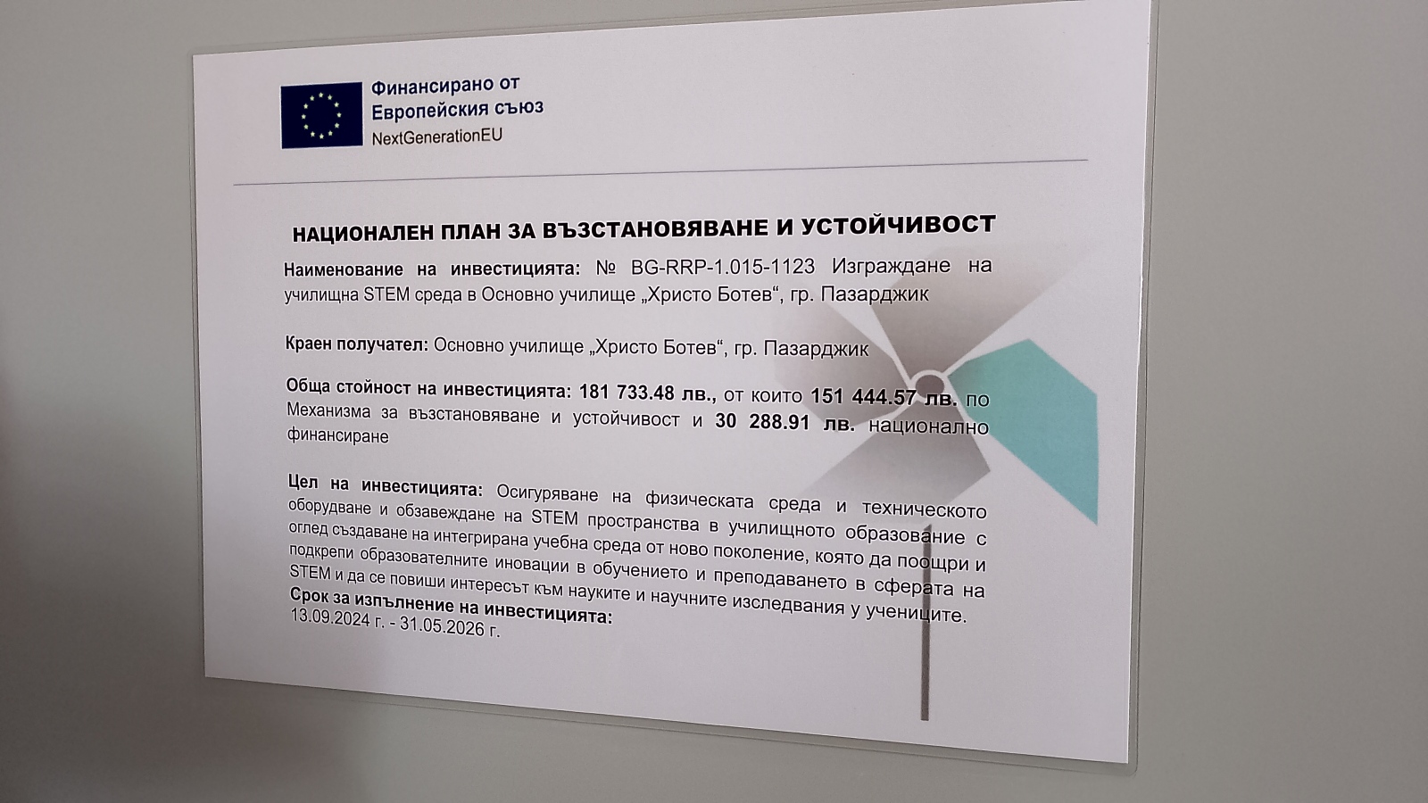 Финансирането за интегрираната учебна STEM среда от ново поколение е за близо 182 000 лева, от които малко над 30 000 лева са национално финансиране, а останалите - по Механизма за възстановяване и устойчивост.