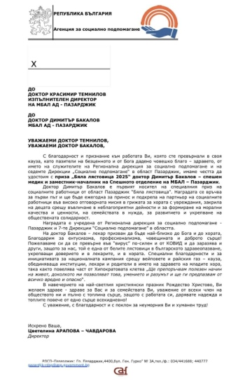 В благодарствено писмо до болницата директорът на Регионалната дирекция за социално подпомагане – Пазарджик, Цветелина Арапова-Чавдарова, изказва благодарност и признание към изпълнителния директор на МБАЛ–Пазарджик, д-р Красимир Темнилов, и д-р Димитър Бакалов за работата, която са превърнали в своя кауза – като пазители на безценното и от Бога дадено човешко благо – здравето.