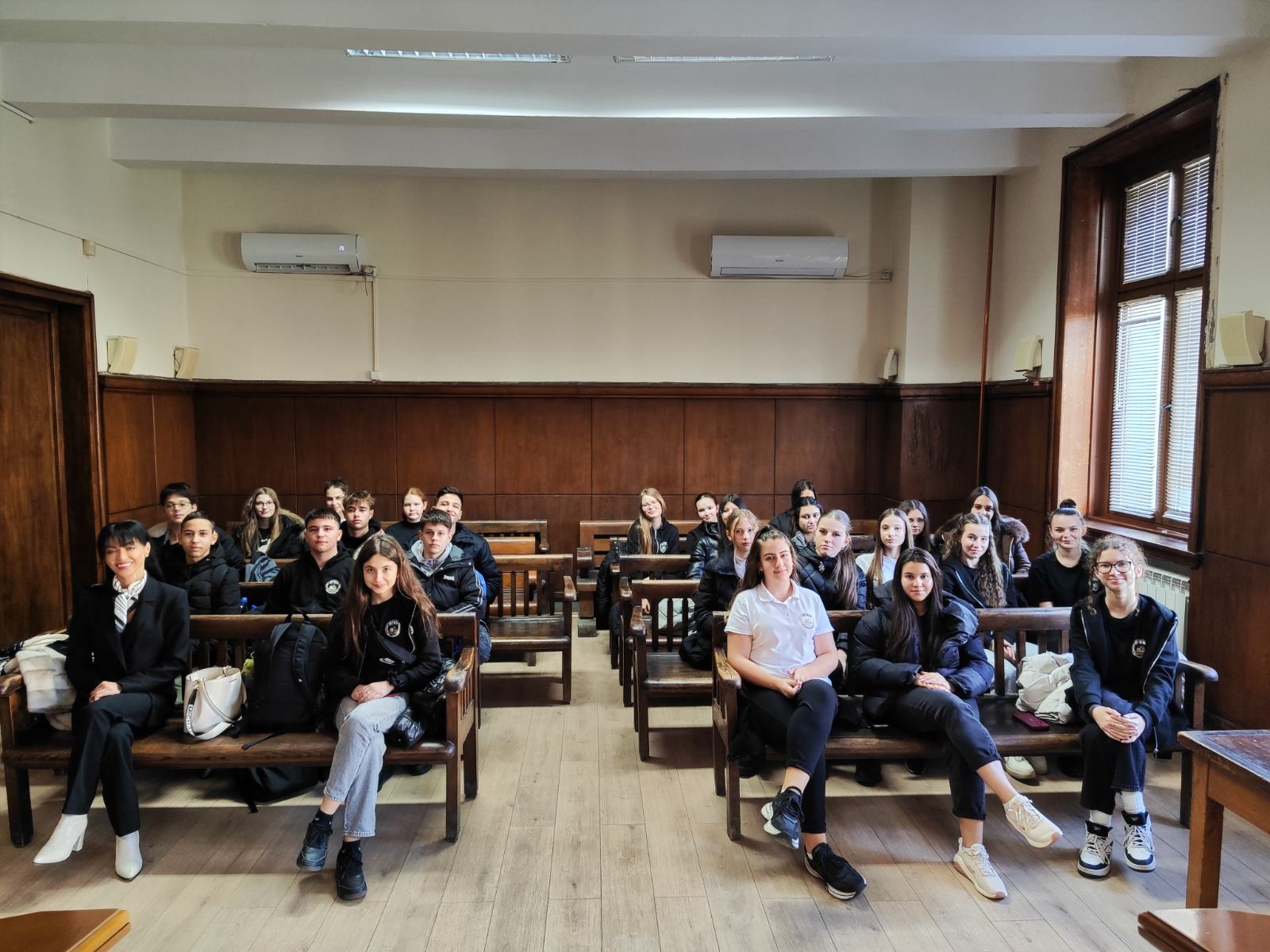 Съдия Петкова, която правораздава в Наказателно отделение изнесе и първата лекция. Тя представи разделението на властите според Конституцията на Република България, професиите "съдия", „прокурор“ и „следовател“ и разясни статута на магистратите. Съдия Петкова даде пример на учениците за развитието на едно престъпление, от началото му в следствието, през работата на прокуратурата и приключването му в съда.