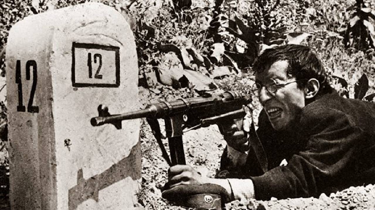 партизани се мъчат да се изтеглят към гората, войниците настъпват, гимназист се е закрил зад километричен камък, стреля срещу тях и вика: „Ние сме на всеки километър“… Композиторът изсвирва на пианото мелодията. После я изсвирва пак. Музиката е ударна, силна, а Вълчев взима едно листче… Ступел му казва, че ако до сутринта не напише текста, сериалът тръгва по телевизията само с оркестрово изпълнение. Поетът си спомня как на път за вкъщи в главата му се върти фразата „Ние сме на всеки километър“. А в полусън му дошли стиховете: