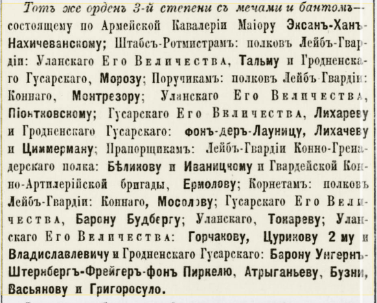 На това смело дело енергично способства и щаб-ротмистър Хрульов, пристигайки с командвания от него взвод. Но и при нас не се размина без загуби: редник Сорочкин бе смъртно ранен от куршум в главата.“
