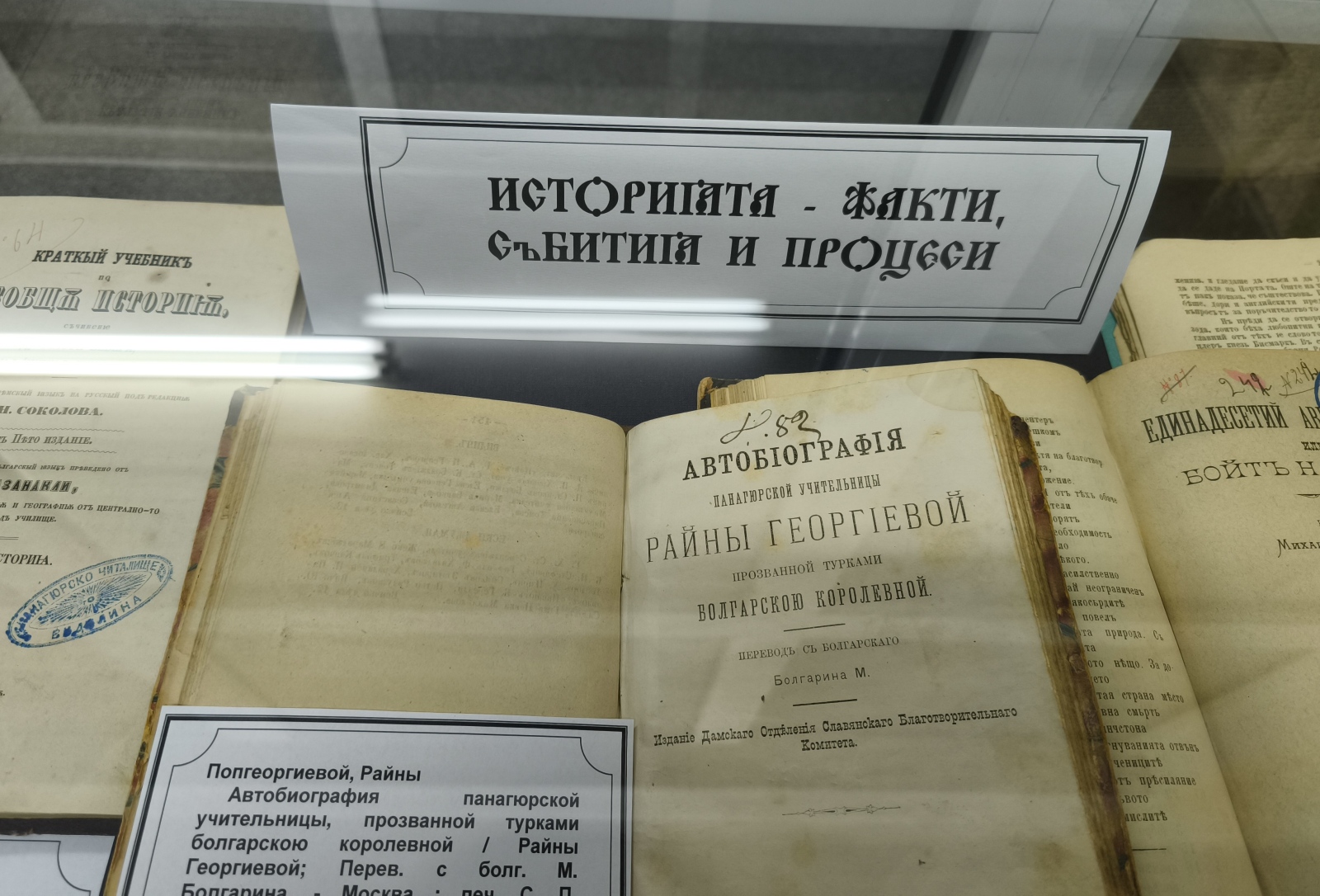 В първата витрина са показани издания, свързани с вярата и християнството, а втората е свързана с образованието. Сред експонатите e учебник, използван от Райна Княгиня, когато е била учителка. Нейната „Автобиография“ може да се види в третата част на експозицията, която представя книги с исторически факти. Част от тях са за Априлското въстание 1876. В четвъртата витрина са подредени издания от периодичния печат през Възраждането. Сред тях е „Гайда: Сатирический вестник за свестявание на българите“, редактиран от Петко Славейков и издаван в Цариград.