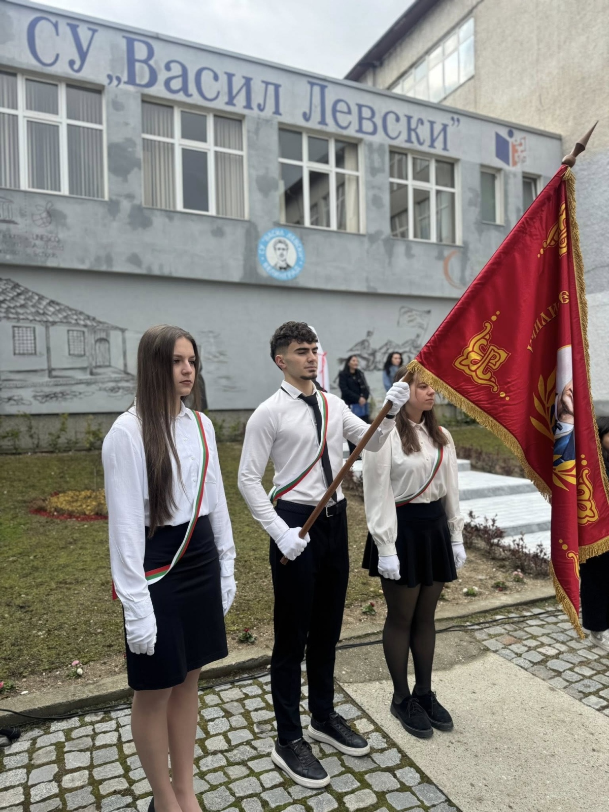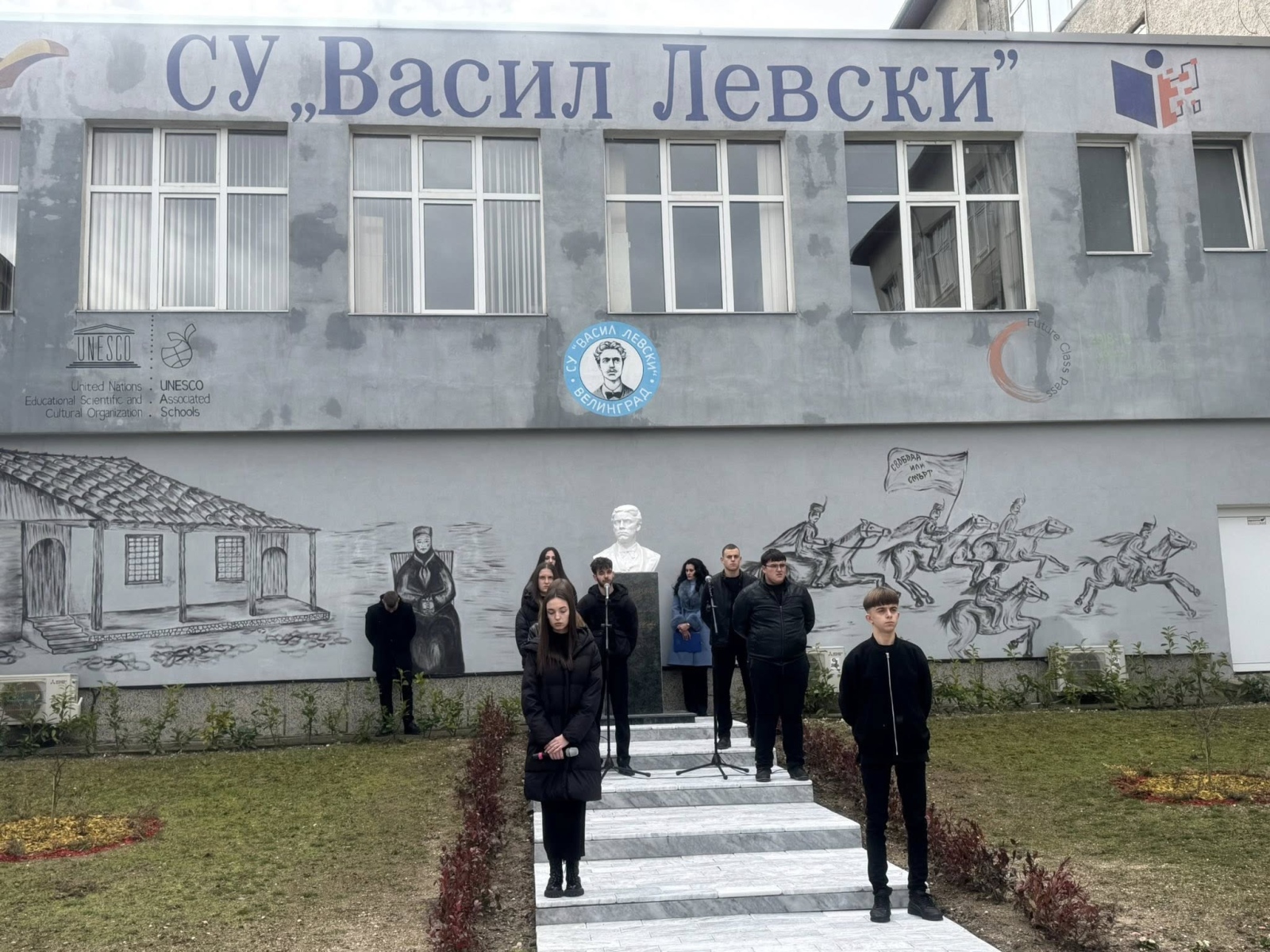 В двора на училището бе обособено красиво и достойно пространство, от което Апостола на свободата „гледа“ гордо и вдъхновява бъдещите поколения. Стената зад паметника бе художествено изрисувана от учителя по изобразително изкуство Георги Стефанов заедно с няколко негови талантливи ученички от шести клас – впечатляващ жест на приемственост между поколенията и живо доказателство, че делото на Левски продължава да се твори с ръцете и сърцата на младите.