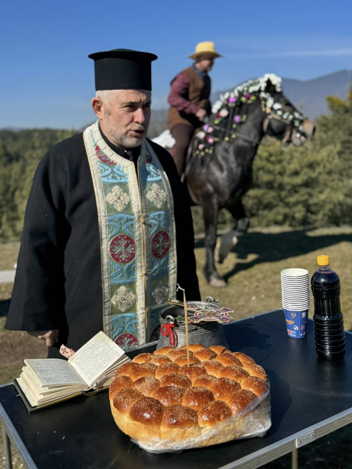 Празничният ден започна с водосвет за здраве и благополучие на имениците, стопаните и техните коне, отслужен от енорийския свещеник отец Антон пред параклис „Свети Георги“, както и с благославяне на обредни хлябове.