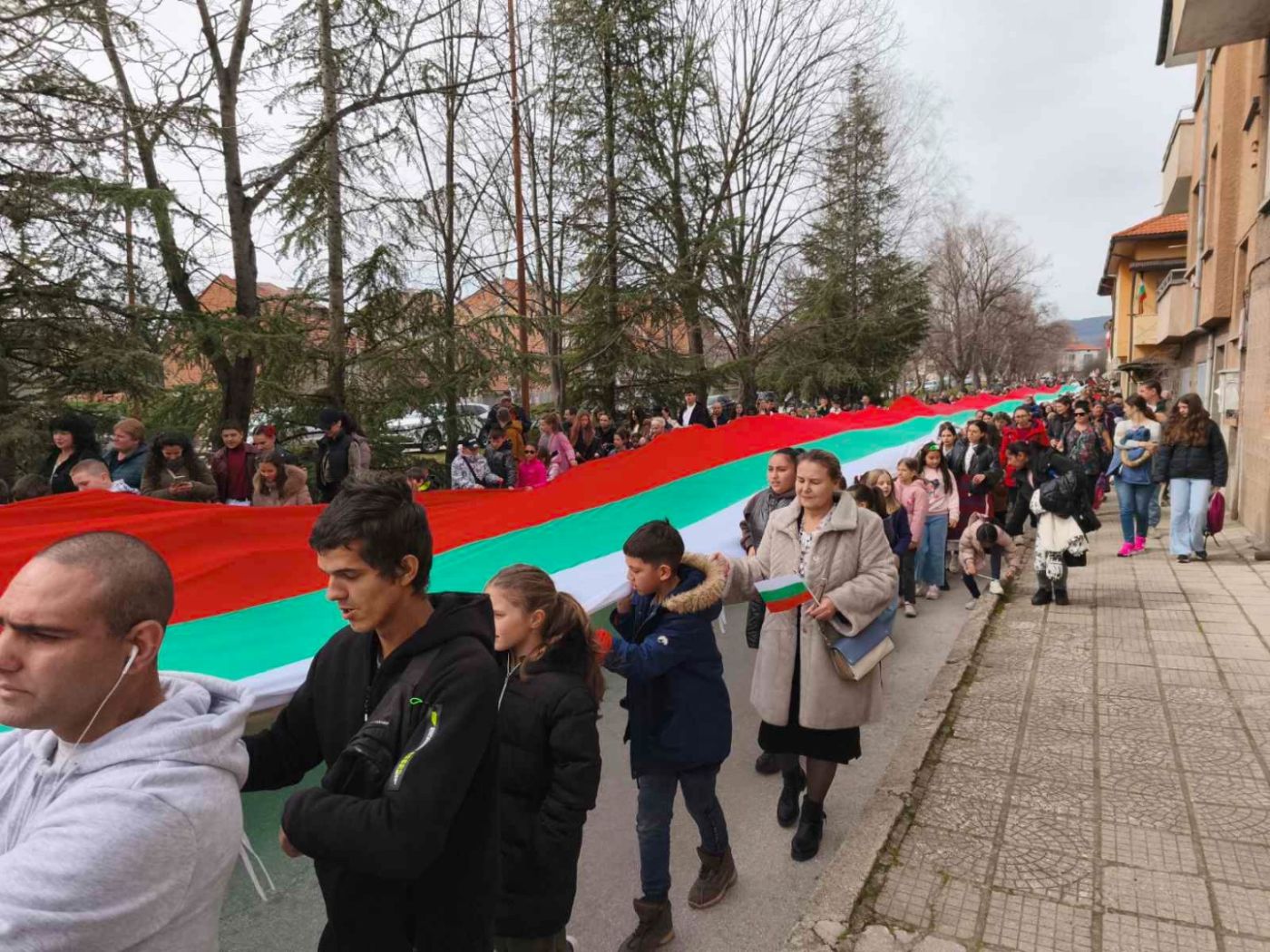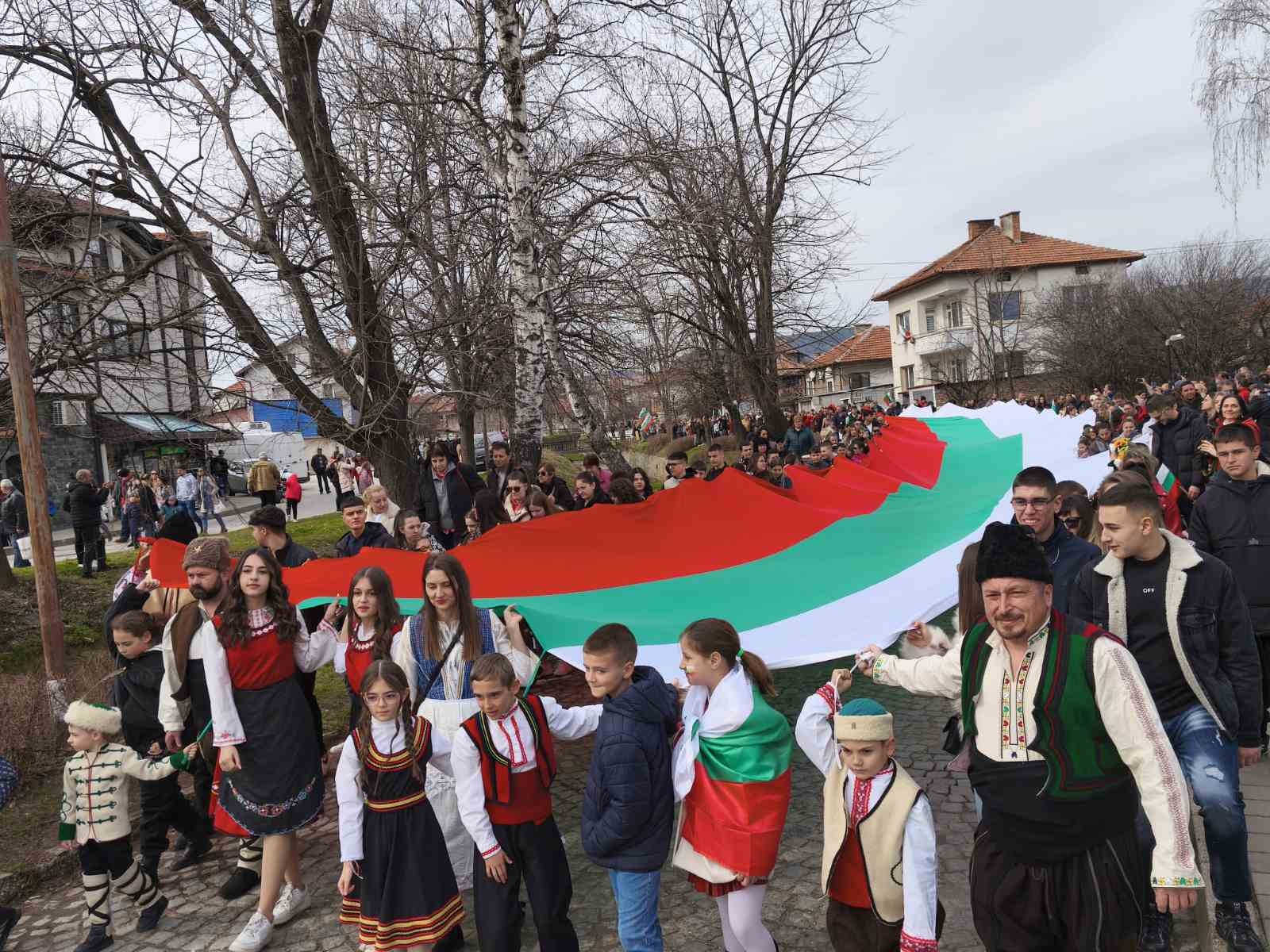 След това започна празничното шествие със110-метровото българско знаме. То премина през част от улица „Райна Княгиня", централния площад „20 април" и продължи към Мемориален комплекс „Априлци" и беше положено на Маньово бърдо. През това време звучаха част от вечните песни на Родината ни, една от които „Моя страна, моя България“.