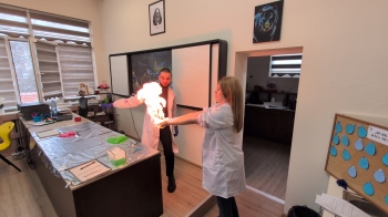 Водещите – ученици от 10. б клас – Лорена Йорданова, Таня Узунова и Тодор Стоянов показаха, че с водата могат да се направят много интересни опити.