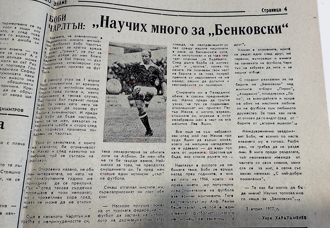 Датата над подписа не приземява много от читателите – те наистина вярват, че Хараламбиев се е срещнал с английската знаменитост, а причината за това е снимката с автограф на Чарлтън! Снимката заслепява всички съмнения, а малцина виждат, че вестникът, който излиза във вторник, четвъртък и събота, е с дата 31 март 1977 г., ден четвъртък – тоест,