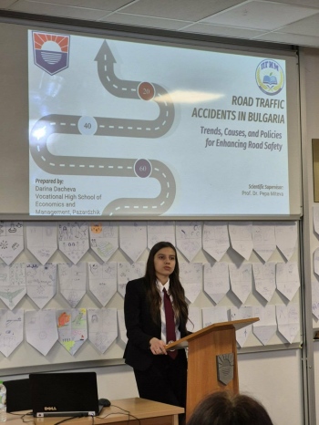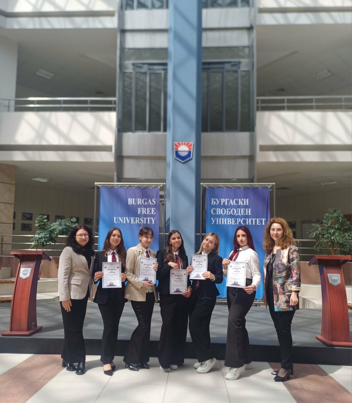 Три екипа от 11. клас достойно представиха нашето училище. С увереност, знания и ангажираност те защитиха своите разработки по изключително актуални и значими теми: „Учим децата да растат с мисъл и грижа за природата“ – Росица Гънина и Анна Благова от 11. Е клас „Пътнотранспортни произшествия в България и повишаване на пътната безопасност“ – Дарина Дачева от 11. А клас „Стресът в съвременното общество и в училищната среда“ – Лия Костуркова и Симона Иванова от 11. А клас Техен научен ръководител и вдъхновител беше проф. д-р Пепа Митева, чиято подкрепа и професионализъм допринесоха за отличното представяне. Техният труд и отдаденост бяха заслужено отличени с: грамоти за участие, плакети/статуетки за успешна тематична разработка, публикация в научното списание на форума. Този успех е доказателство, че когато знанието срещне мотивацията, се раждат истински постижения. Вярваме, че това е само началото на още много бъдещи успехи!", изтъкват от училището.