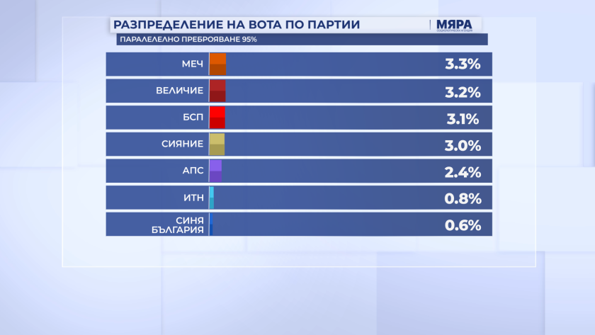 Според данните към 95% паралелно преброяване на агенция "Мяра" мандатите се разпределят: