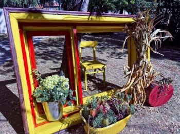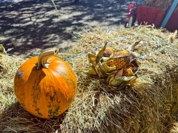 РАКИТОВО. Каручка, бали сено, тикви, царевица, червени листа и плашила – есенната украса, която стана традиционна, вече е поставена в центъра пред сградата на Общината, а общинската котка Рижка първа си я хареса и позира с удоволствие за фотосесия още преди най-ранобудните ракитовци.