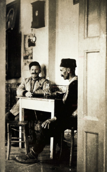 - така бяха наречени шишетата с вино, защото по това време много шум се вдигаше около сръбския владика Фирмилян, който бе назначен в Скопие. Бае Георги, като весел човек, взимаше наравно участие с нас почти всяка вечер. По цели нощи се прекарваше в смях и веселие в неговото заведение. Програмите на тия интимни забавления бяха разнообразни и нескончаеми. Главният изпълнител беше Божинов. Голяма роля в тия забавления играеше един стар цилиндър, който принадлежеше на компанията и който бае Георги грижливо пазеше.