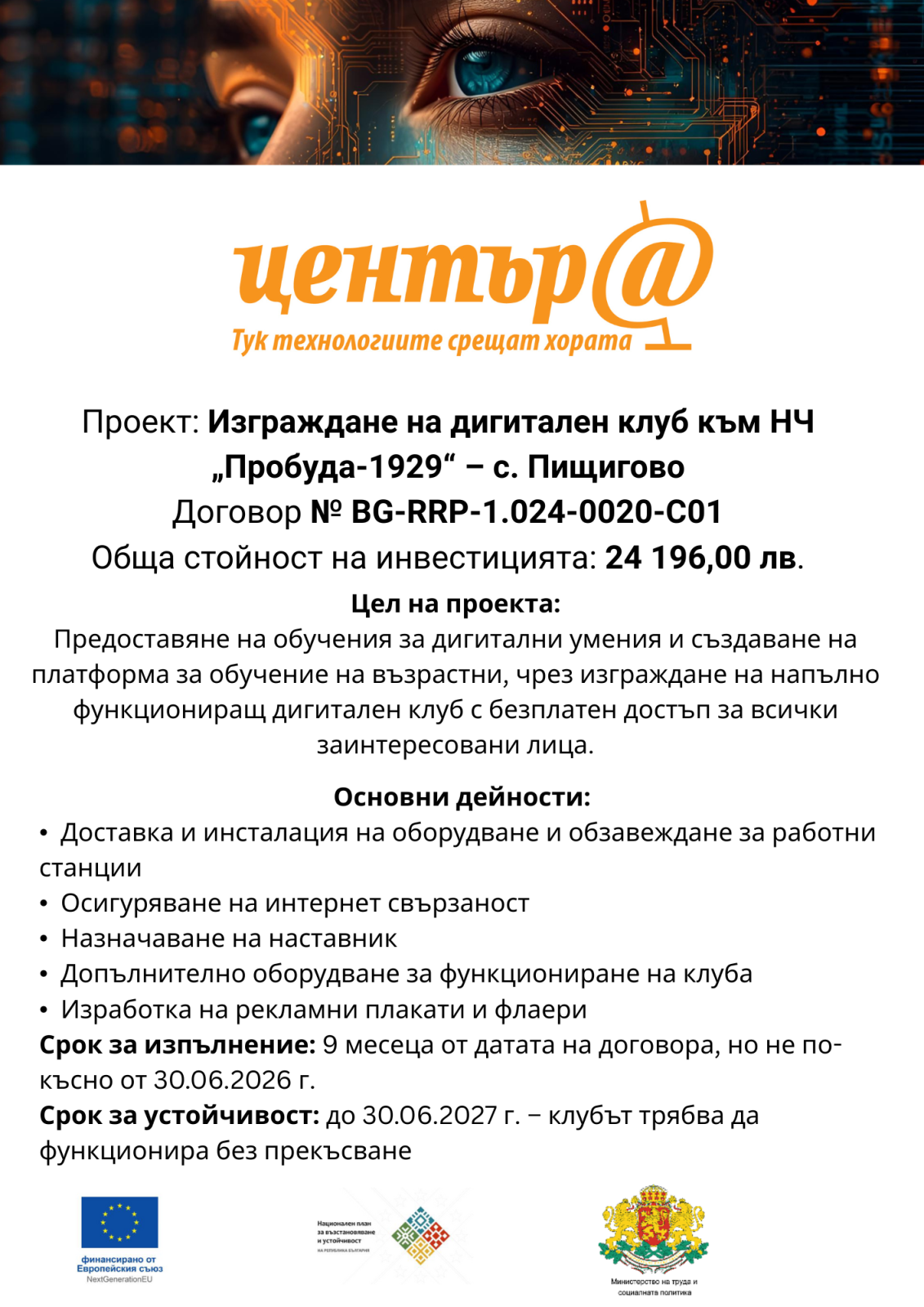 Секретарят на читалището в Пищигово Латинка Мемедали поясни пред „Знаме“, че помещението, предназначено за Дигиталния клуб, е ремонтирано със собствени усилия и с дарени материали от магазин КРЕЗ, за което хората тук са изключително благодарни. По проекта са отпуснати 24 196 лева, с които е оборудвано помещение с работни станции, интернет връзка и е назначен наставник за обучение на възрастни хора за придобиване на дигитални умения.