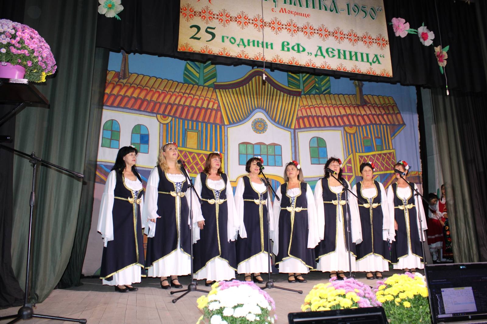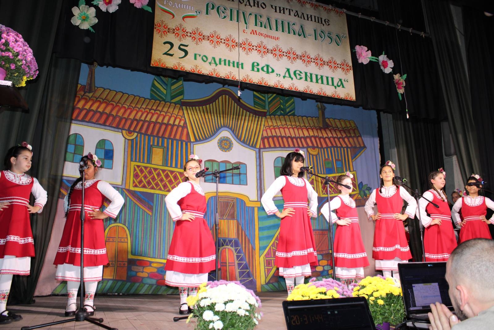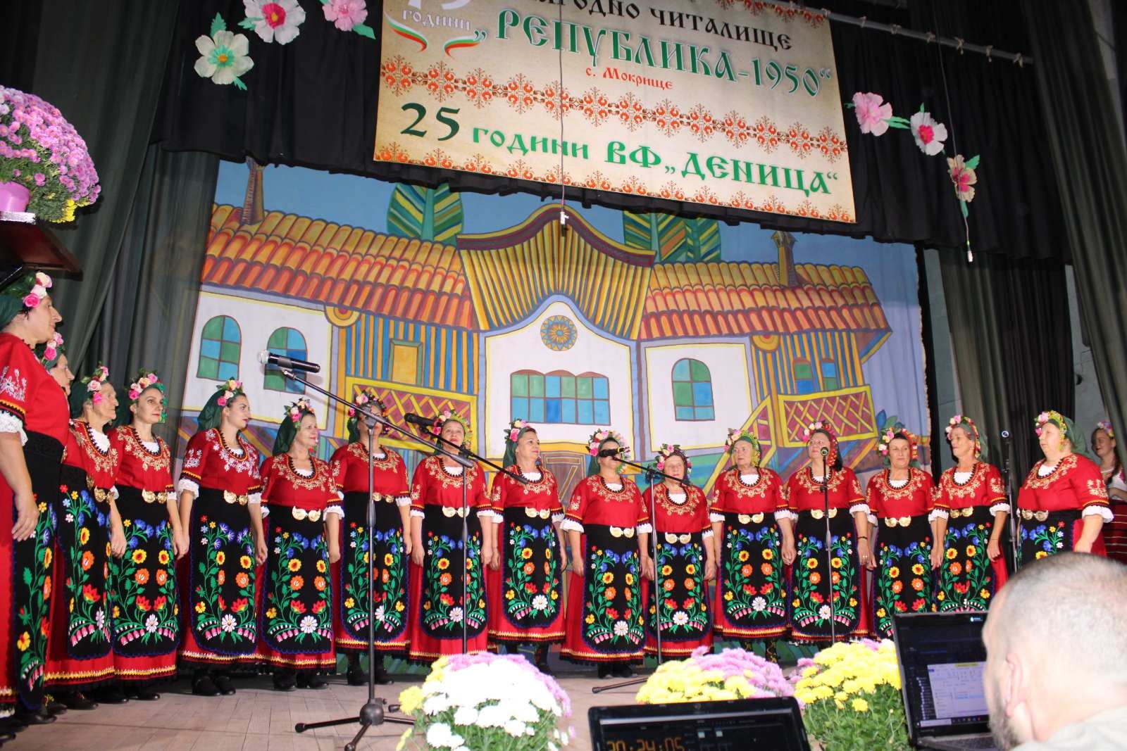МОКРИЩЕ. Двоен юбилеен празник имаше в селото послучай 75-годишнината на НЧ „Република“ и 25 години творческа дейност на Вокална формация „Деница“ в унисон с Деня на будителите - 1 ноември. Богатата програма започна със знаковата за всеки българин песен „Излел е Делю хайдутин“, изпълнена от малката Рая Дочин (съпровод на гайда - Николай Балабанов) и завърши с „Многая лета“ и разрязване на торта. Имаше много цветя, приветствия и пожелания от представителите на Министерството на културата, местната власт, културните и образователните институции в региона. По случай празника читалището