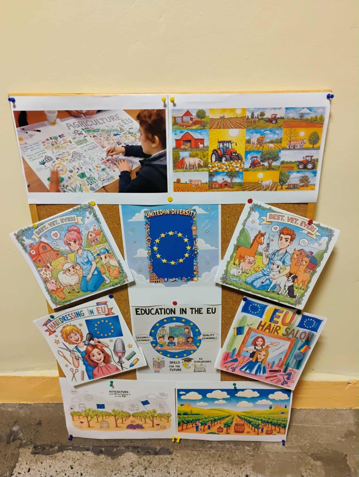 Освен върху изложбата, учениците от клубовете насочиха усилията си и към създаването на малки постери на тема „Моята професия в ЕС“, също изработени с помощта на изкуствен интелект. В тях те представиха своето виждане за бъдещето на професиите, по които се обучават в гимназията – „Земеделието в ЕС“, „Животновъдството в ЕС“, „Лозарството в ЕС“ и „Фризьорството в ЕС“. Чрез тези творби учениците показаха как традиционните умения могат да се впишат в съвременния европейски контекст, обединявайки професионалното знание с иновациите и новите технологии.