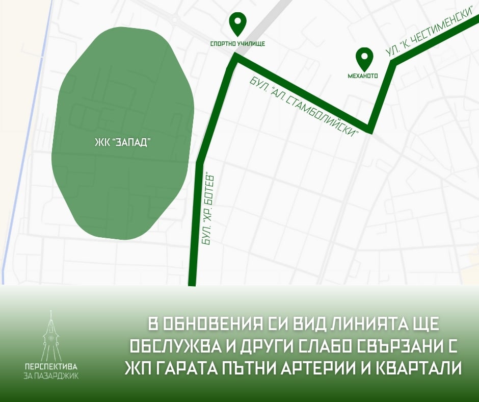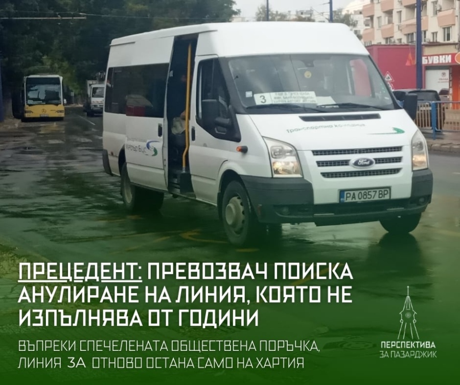 Възстановената с решение на Общински съвет - Пазарджик вътрешноградска автобусна линия 3А продължава да не се изпълнява въпреки сключения договор между администрацията и „Хебърбус“ АД, алармират от гражданската инициатива "Перспектива за Пазарджик", а според един от активистите - Ангел Нейков, случаят повдига въпроси за контрола върху обществения транспорт и за изпълнението на поетите ангажименти по спечелената обществена поръчка. По информация на гражданската инициатива, транспортното дружество е поискало анулиране на линията, която обаче на практика не се изпълнява от 7-8 години. В мотивите си превозвачът се е позовал на нулев пътникопоток – аргумент, който предизвиква съмнения, тъй като дружеството не посочва кога линията е функционирала реално. От общинската администрация са уведомили „Хебърбус“ АД, че искането за прекратяване изпълнението на курсовете по линия 3А не е прието. По данни на гражданската инициатива, кметът на Община Пазарджик Петър Куленски е настоял за възстановяване на редовното ѝ изпълнение в рамките на действащия договор с превозвача. Въпреки това към момента остава неясно дали линия 3А е реално заложена за изпълнение от идната седмица и какъв контрол ще бъде упражнен върху движението ѝ, за да не бъде поставена под въпрос ефективността на възстановяването ѝ. Поставен е и въпросът за възможна промяна на маршрута с цел повишаване на рентабилността и използваемостта на линията. От „Перспектива за Пазарджик“ посочват, че са внесли предложение за редакция на маршрута, което да осигури обслужване и на кварталите „Запад“, „ДЗС“ и „Писковец“, наред с жилищните комплекси „Ябълките“ и „Младост“, оставащи несвързани с ключовите локации в града – жп и автогарата.