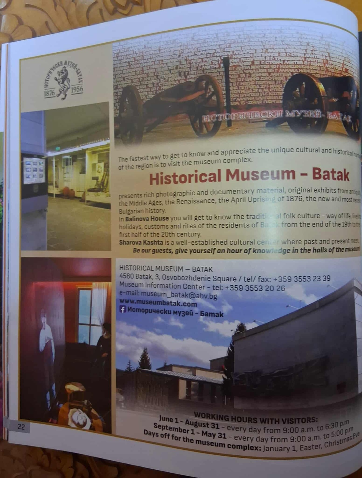 БАТАК. Историческият музей в бунтовния град се рекламира на международните туристически изложения в Лондон и Букурещ чрез списание „Дестинация България“ на щанда на Министерството на туризма. В изданието с интригуващ текст и снимки Исторически музей-Батак е представен като обект с впечатляващи експозиции и изключително богат фонд, който заслужава да бъде посетен. На Световното изложение в Лондон изданието бе презентирано и в медийния център.