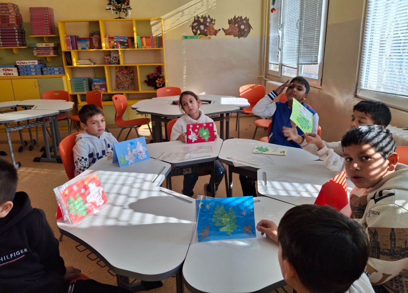 Читалището и учениците от 1 клас с класен ръководител Малинка Хаджиева, второкласниците с класен ръководител Цветанка Сапункова и децата от предучилищна група "Зайчета" с учител Йорданка Петкова сътвориха вълшебни коледни картички, изпяха най-празничните песнички и рецитираха най- красивите коледни стихчета.