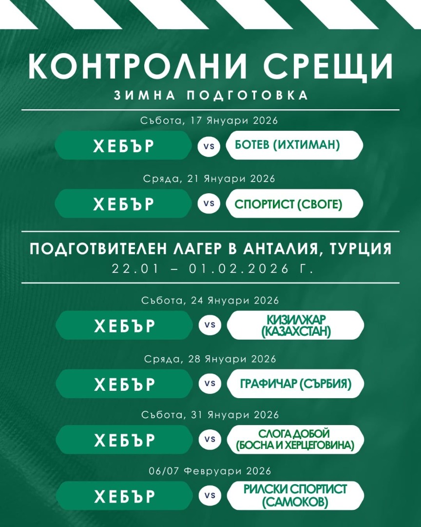 Общо 6 контроли ще изиграе Хебър в зимната си подготовка. Ето кои са те: