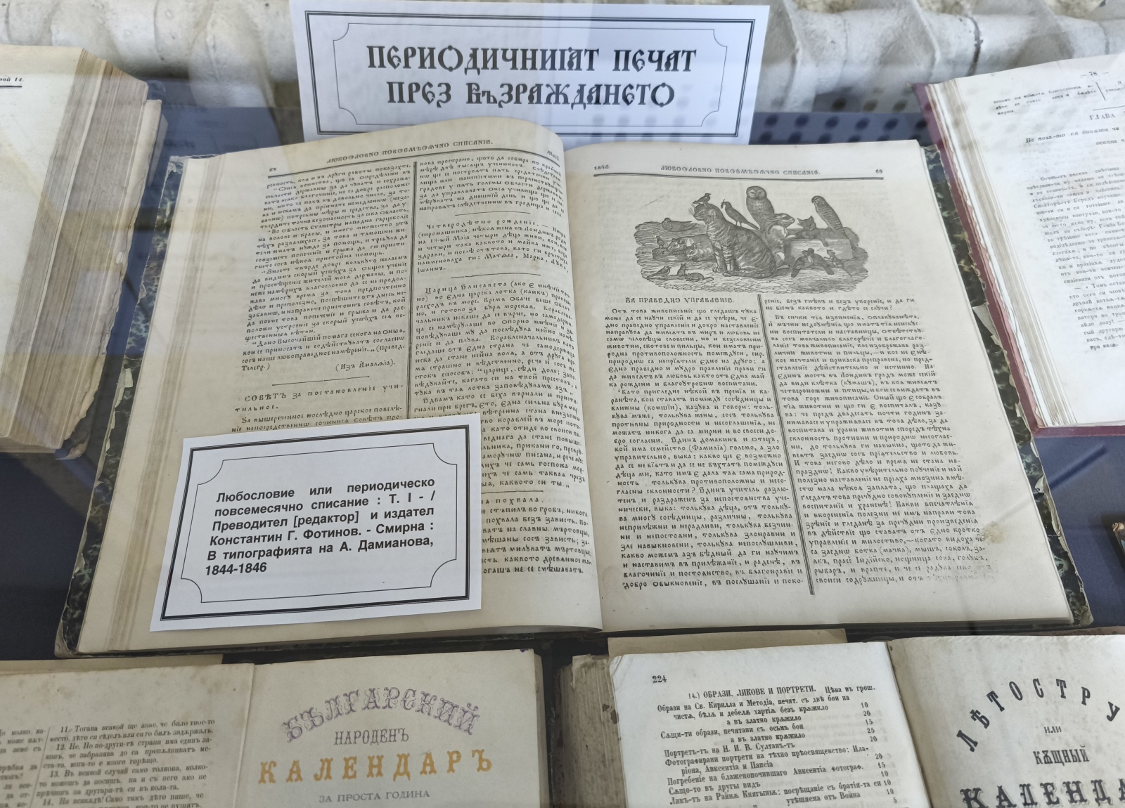 В първата витрина са показани издания, свързани с вярата и християнството, а втората е свързана с образованието. Сред експонатите e учебник, използван от Райна Княгиня, когато е била учителка. Нейната „Автобиография“ може да се види в третата част на експозицията, която представя книги с исторически факти. Част от тях са за Априлското въстание 1876. В четвъртата витрина са подредени издания от периодичния печат през Възраждането. Сред тях е „Гайда: Сатирический вестник за свестявание на българите“, редактиран от Петко Славейков и издаван в Цариград.