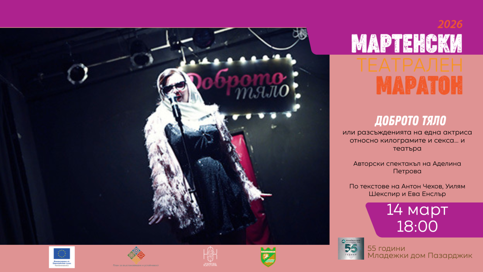 Единадесетото издание на „Мартенски театрален маратон“ продължава на 14 март (събота) от 18:00 ч. в Младежки дом – Пазарджик с провокативния авторски спектакъл на Аделина Петрова „Доброто тяло или разсъжденията на една актриса относно килограмите, и секса и… театъра“.