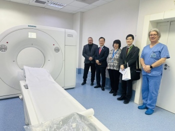 След работната среща в сградата на Община Панагюрище чуждестранната делегация гостува на МБАЛ „Уни Хоспитал“, където се запозна с високотехнологичните възможности на болницата, работата в Онкологичния център, Центъра за образна диагностика, хеликоптерната площадка и Циклотронния комплекс.