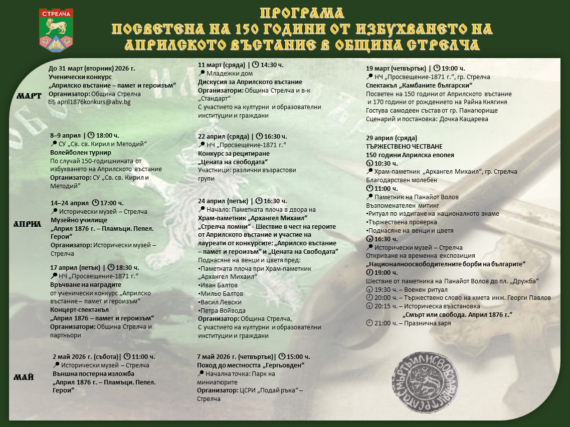 По този повод Община Стрелча, съвместно с културни и образователни институции, организира поредица от инициативи, които ще се проведат в периода март – май 2026 г. Програмата включва конкурси, дискусии, културни прояви, изложби, възпоменателни церемонии и историческа възстановка.