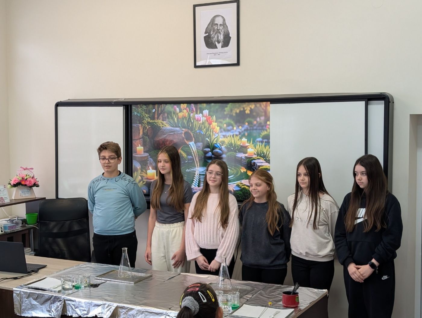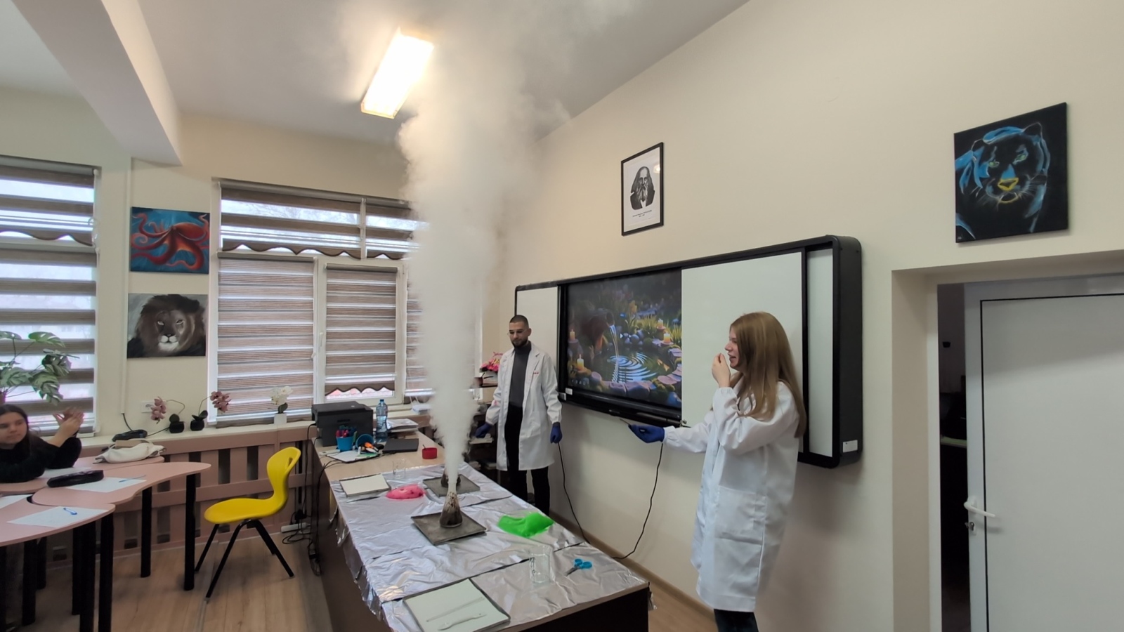Водещите – ученици от 10. б клас – Лорена Йорданова, Таня Узунова и Тодор Стоянов показаха, че с водата могат да се направят много интересни опити.