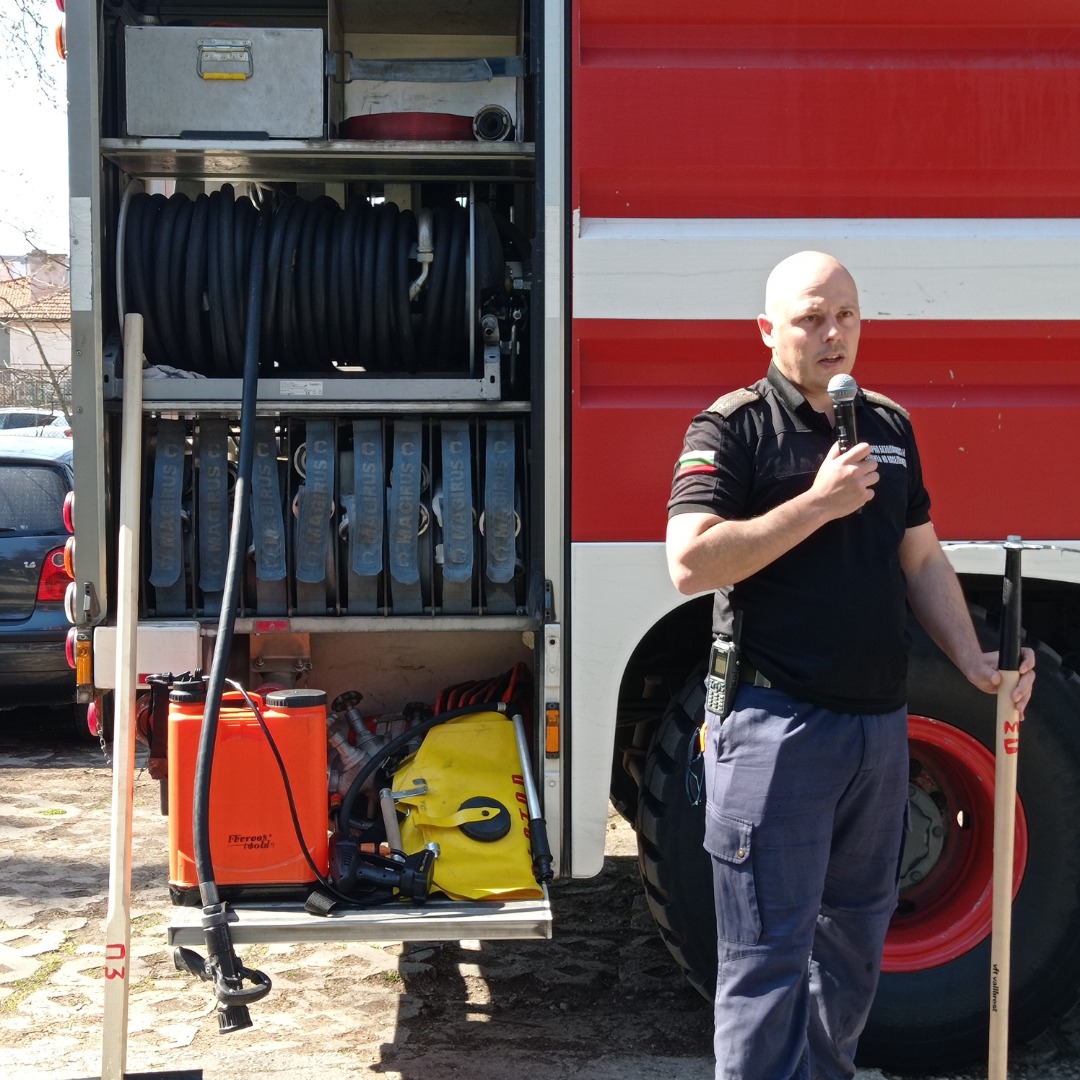 Инспектор Тодоров от РДПБЗН-Пазарджик и колегите му запознаха учениците със специфичното оборудване и техника за гасене на горски пожари, включително и иновации, направени „на терен“ от огнеборците – като поставения акумулаторен пистолет на стандартна пръскачка с вода, който по този начин спестява усилия на пожарникарите…
